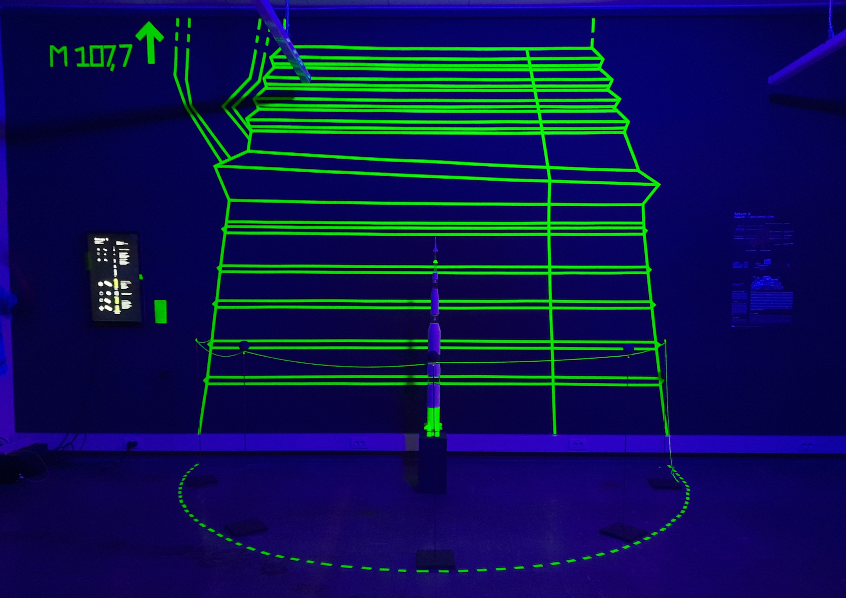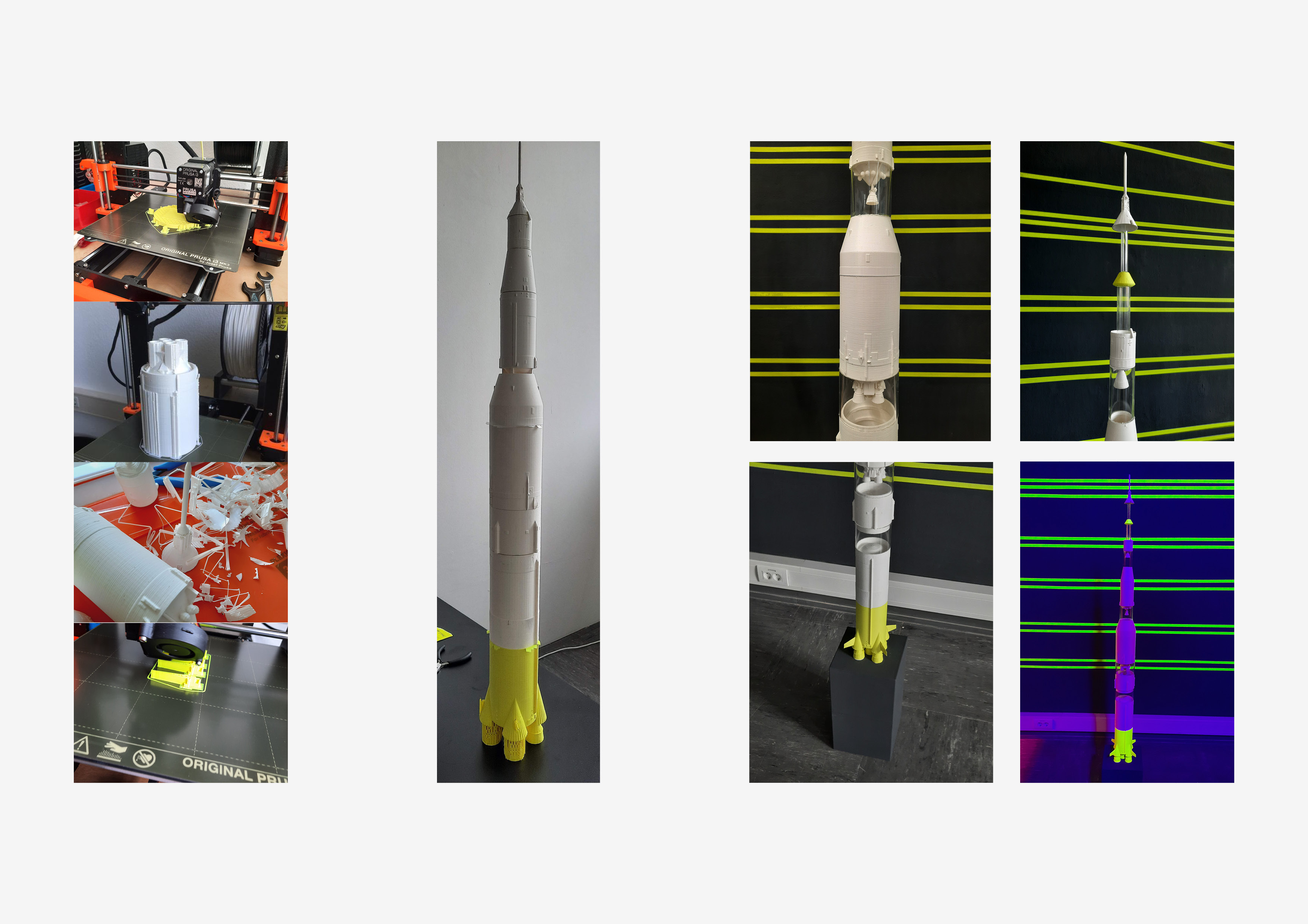 Die Arbeit umfasst ebenso die Ausstellung des Realobjektes als 3D gedruckte Saturn V Modell Rakete im Maßstab 1:100.
