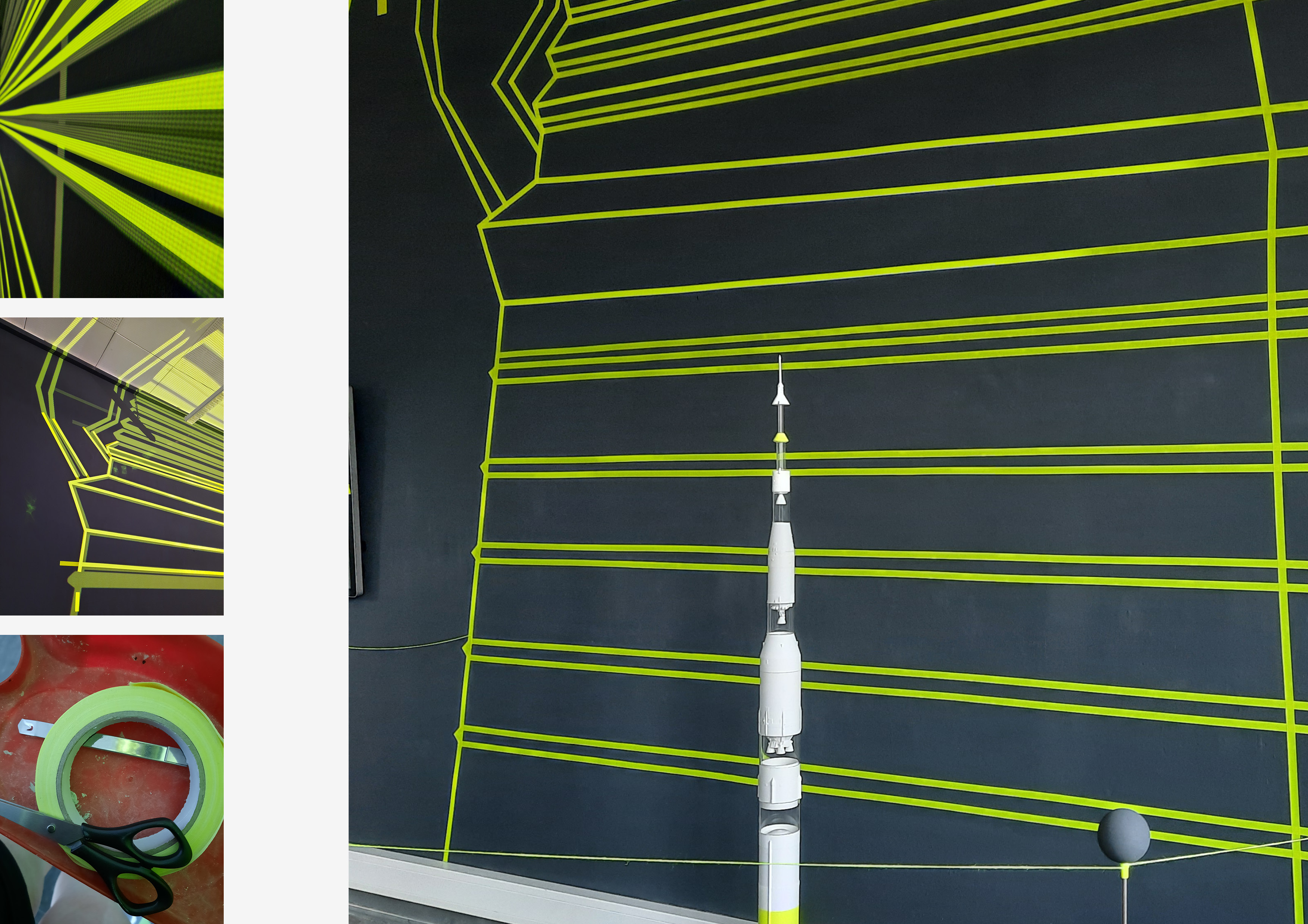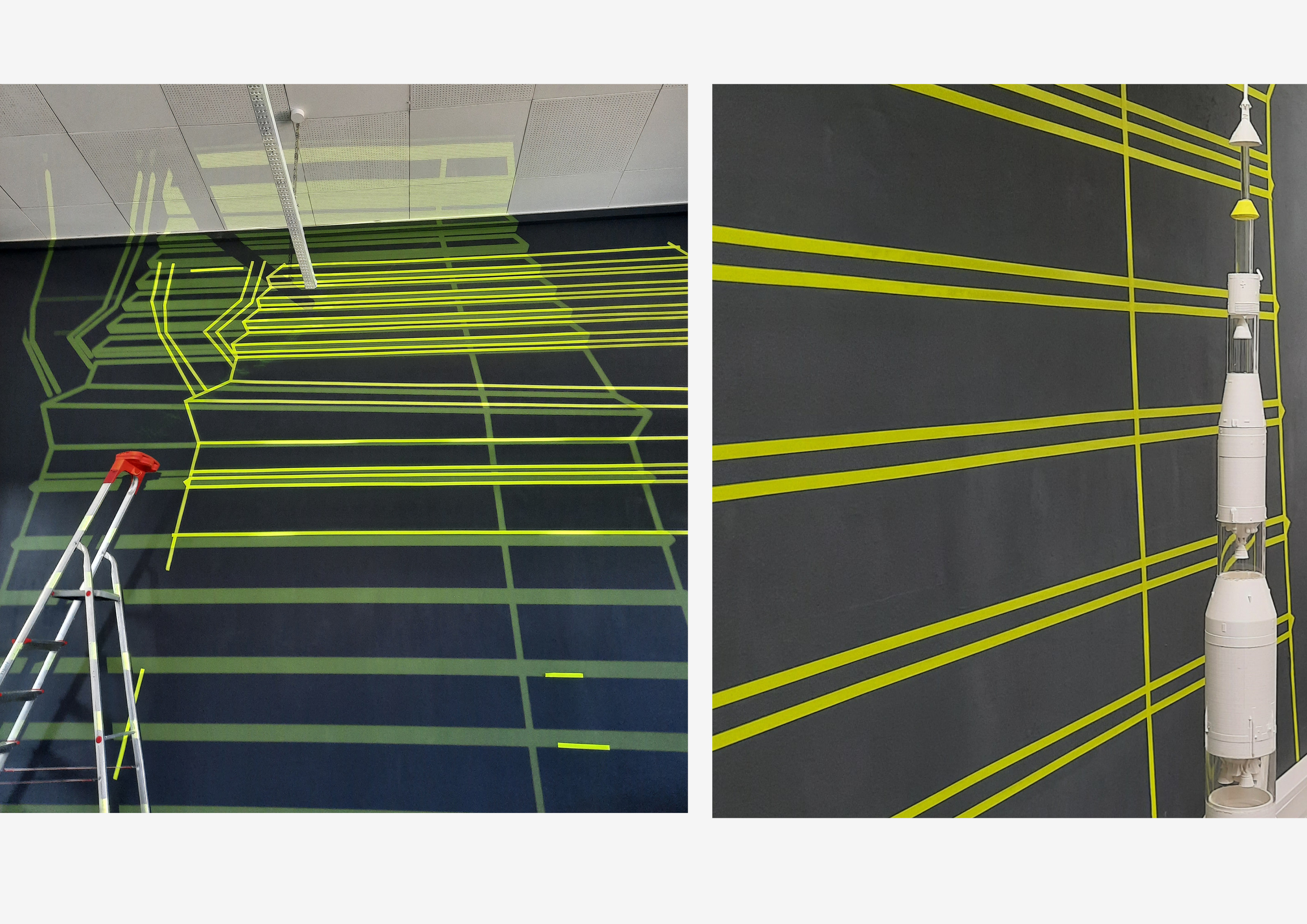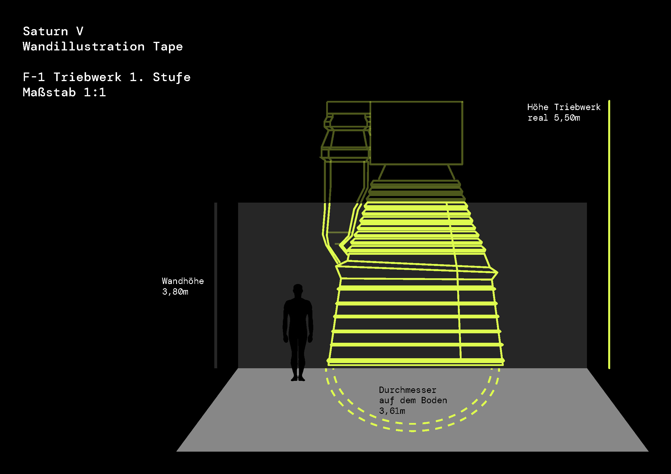 Die Präsentation wird durch eine Linienillustration im Maßstab 1:1 eines unteren F-1 Triebwerks der Saturn V Stufe-IC an einer Wand angebracht erweitert. Gerade diese Darstellung erlaubt es den Betrachtern, die Dimensionen durch Betreten der Installation selbst zu erfahren.