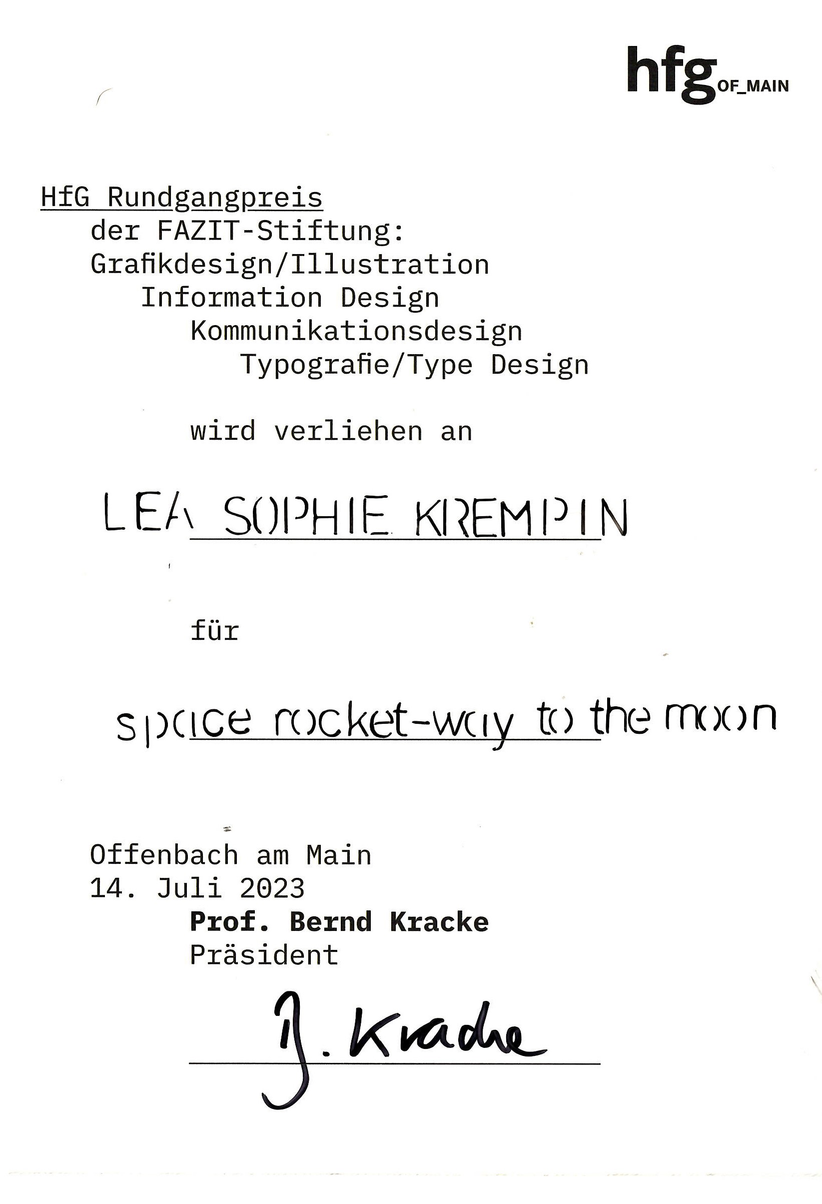 "Der Preis geht an Lea Sophie Krempin und »space rocket - way to the moon«. Mit ihrer Arbeit holt sie uns auf hohem Niveau ab und zeigt detailliert, wie komplex (und groß) die Herausforderungen der Zukunft der Raumfahrt ist. 3, 2, 1, los gehts!"