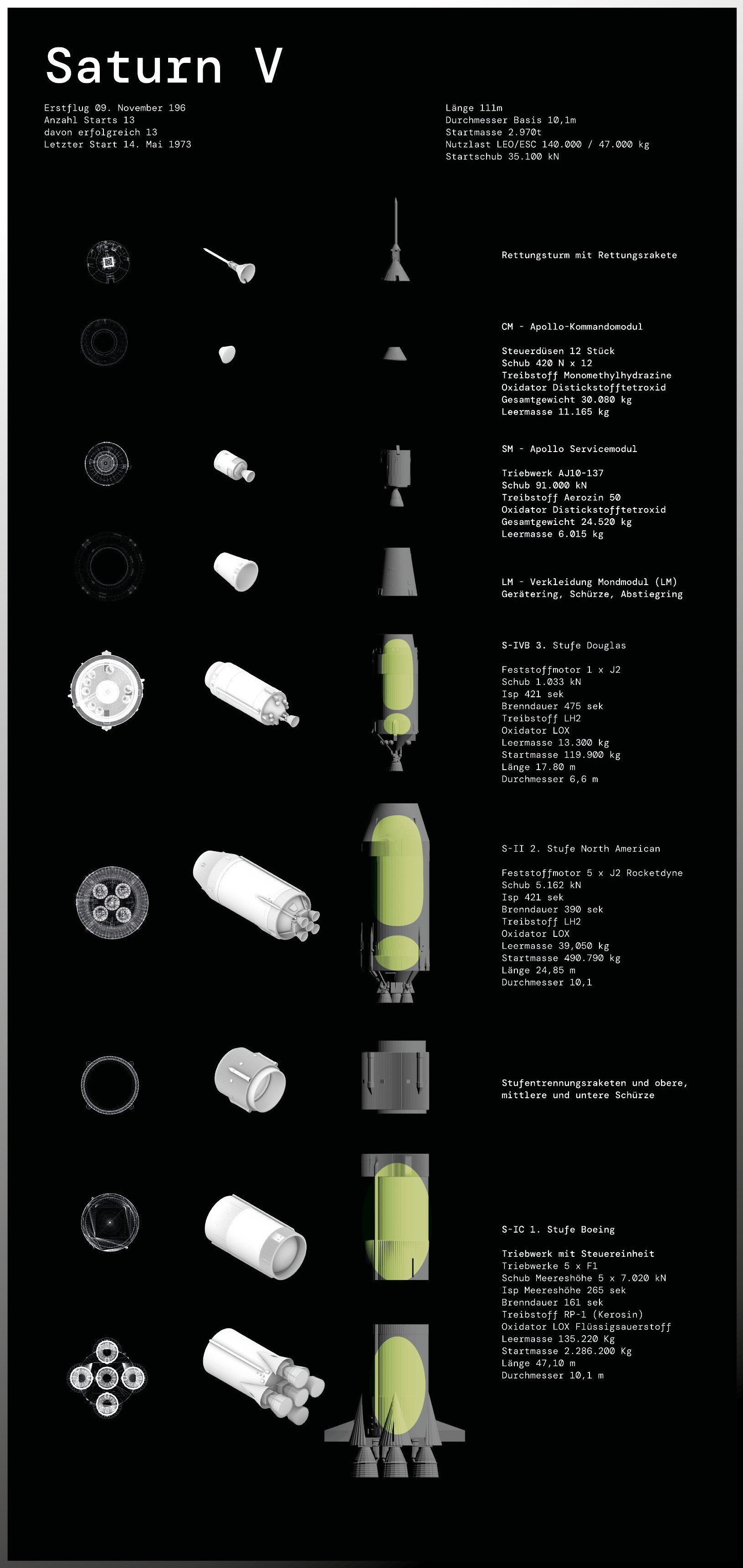 Hierzu beruht die Arbeit „space rocket - way to the moon“ auf einer Auseinandersetzung mit der Saturn V Mondrakete, die während der NASA Apollo 11 Mission im Jahr 1969 die ersten Menschen auf dem Mond landen ließ.Die Mondlandung am 20. Juli 1969 mit einer Saturn V der NASA war ein Ereignis in der Raumfahrttechnik, das die große Nutzlast und Leistungsmöglichkeiten der Saturn Familie repräsentierte und den USA den herausragenden Meilenstein im Wettlauf ins All erreichen ließ. Weltweit wurde die erste Landung der Astronauten Neil Armstrong, Edwin „Buzz“ Aldrin und Michael Collins in Fernsehübertragungen gezeigt, rund 600 Millionen Menschen verfolgten die ersten Schritte zweier Menschen auf der Mondoberfläche und die globalen, politischen Unruhen, die Katastrophen und der Vietnam Konflikt rückten für eine kurze Zeit aus dem Fokus. Die Saturn V wurde neben der Apollo 11 Mission erfolgreich bei den Missionen 4, 6 und 8 bis 17 eingesetzt.1 Die 111 m hohe Heavy Lift Rakete war bis dato die stärkste Rakete der NASA und übertraf mit ihrer Nutzlast und Leistung die Raketen Saturn-I und Saturn-IB weit.2 Im Gegensatz zu den zweistufigen Vorläufern, wurde bei Saturn V eine dritte Stufe und ein neues Triebwerksystem verbaut. Die Leitung über den Bau des größten Modells der Saturn Familie übernahm erneut Wernher von Braun und sein Team im Marshall Space Flight Center in Huntsville, Alabama. Die Saturn V war eine dreistufige Rakete, die für den Transport von Menschen und Fracht in den Weltraum konzipiert wurde. Die Rakete bestand aus drei Hauptteilen: dem S-IC (erste Stufe), dem S-II (zweite Stufe) und dem S-IVB (dritte Stufe). Die erste Stufe war mit fünf F-1 Triebwerken ausgestattet, die insgesamt 7,5 Millionen Pfund Schub erzeugen konnten. Diese Triebwerke waren die leistungsstärksten jemals gebauten Raketenantriebe und ermöglichten es der Rakete, die Schwerkraft der Erde zu überwinden und in den Weltraum zu gelangen. Die zweite Stufe verwendete fünf J-2 Triebwerke, die flüssigen Wasserstoff und flüssigen Sauerstoff als Treibstoff verwendeten. Diese Triebwerke lieferten insgesamt 1 Million Pfund Schub und halfen der Rakete, die Geschwindigkeit zu erhöhen und die Erdumlaufbahn zu erreichen. Die dritte Stufe, der S-IVB, verwendete ein J-2 Triebwerk und war in der Lage, die Nutzlast in die gewünschte Umlaufbahn zu bringen.