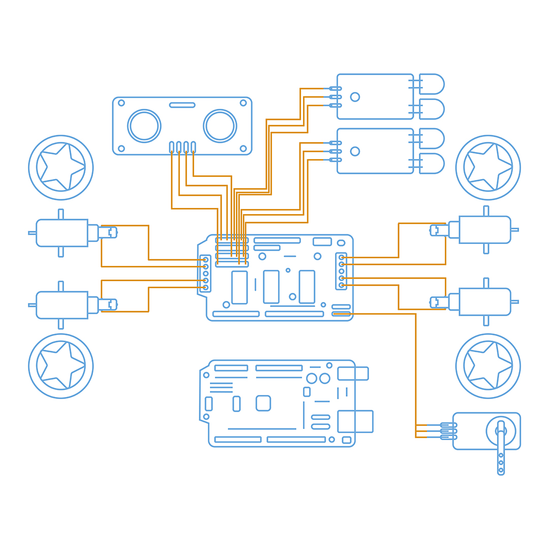 Ein programmierter Roboter, der mittels Ultraschall- und Infrarotsensoren in Interaktion tritt und Bewegungen visualisiert.